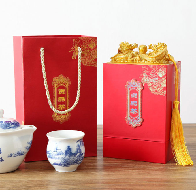 Trà ô long hộp rồng có kích thước cao 22cm, rộng 9,5cm x dài 12,5cm bên trên nắp hộp là song long tranh châu, với màu đỏ tươi sang trọng đẹp mắt ấn tượng và độc đáo tạo nên một hộp trà vô cùng bắt mắt, bên trong gồm có 200G trà Ô Long Cao cấp.